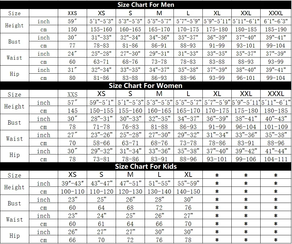 Different size chart for different gender, so please kindly leave us a note of your gender (Man, Woman, Kid) when you choose the size. (E.g. Kid XL)